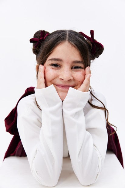 "Introducing the super-cool, cloud-soft White High-Neck Top! It’s the perfect comfy hug for your neck when the December air gets chilly. This sparkling white top is great for pairing with bright maroon skirts or cozy jackets, letting your little star shine brightly and stay super snug while celebrating Qatar National Day 2025!"