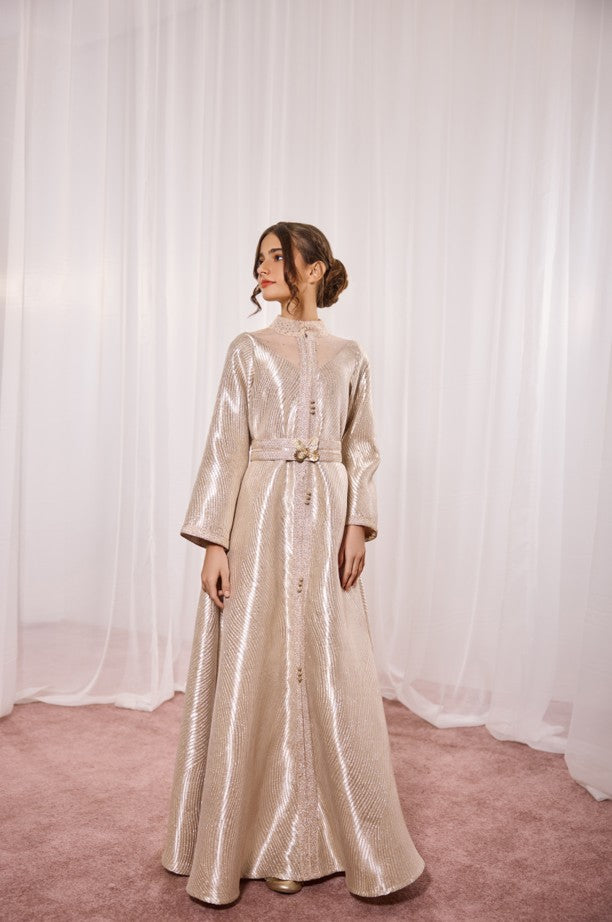 Radiate luxury this season with the Beige Kaftan, an exquisite piece from the Scarlet Kids Ramadan 2026 Collection. This gown is designed for those who desire a regal and modern look, combining striking metallic textures with delicate, hand-finished details.