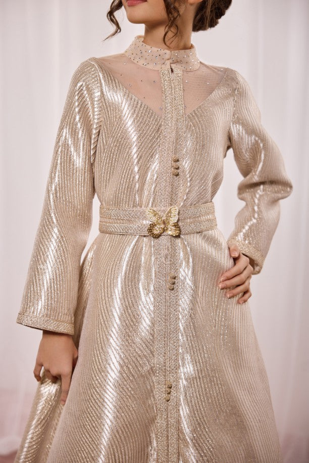 The garment is crafted from a premium beige-tone pleated fabric that features a high-shine, shimmering finish. The bodice is elevated with a sheer illusion neckline adorned with sparkling crystals and a sophisticated mandarin collar. Centered on the braided metallic waistband is a stunning 3D gold butterfly buckle, serving as a signature whimsical touch for this collection. Complete with traditional decorative buttons and a flowing A-line silhouette, this kaftan is a true statement of elegance.