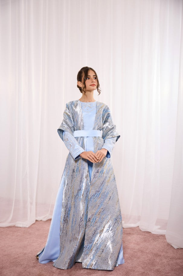 The set features a sleek inner dress with elegant silver embroidery at the neckline. Over it, an open-style jalabiya coat is crafted from a premium metallic brocade fabric in shades of ice blue, silver, and gold. The cuffs are heavily detailed with intricate sequin and beadwork patterns, while a coordinated satin-finish waistband cinches the look for a tailored, regal fit.