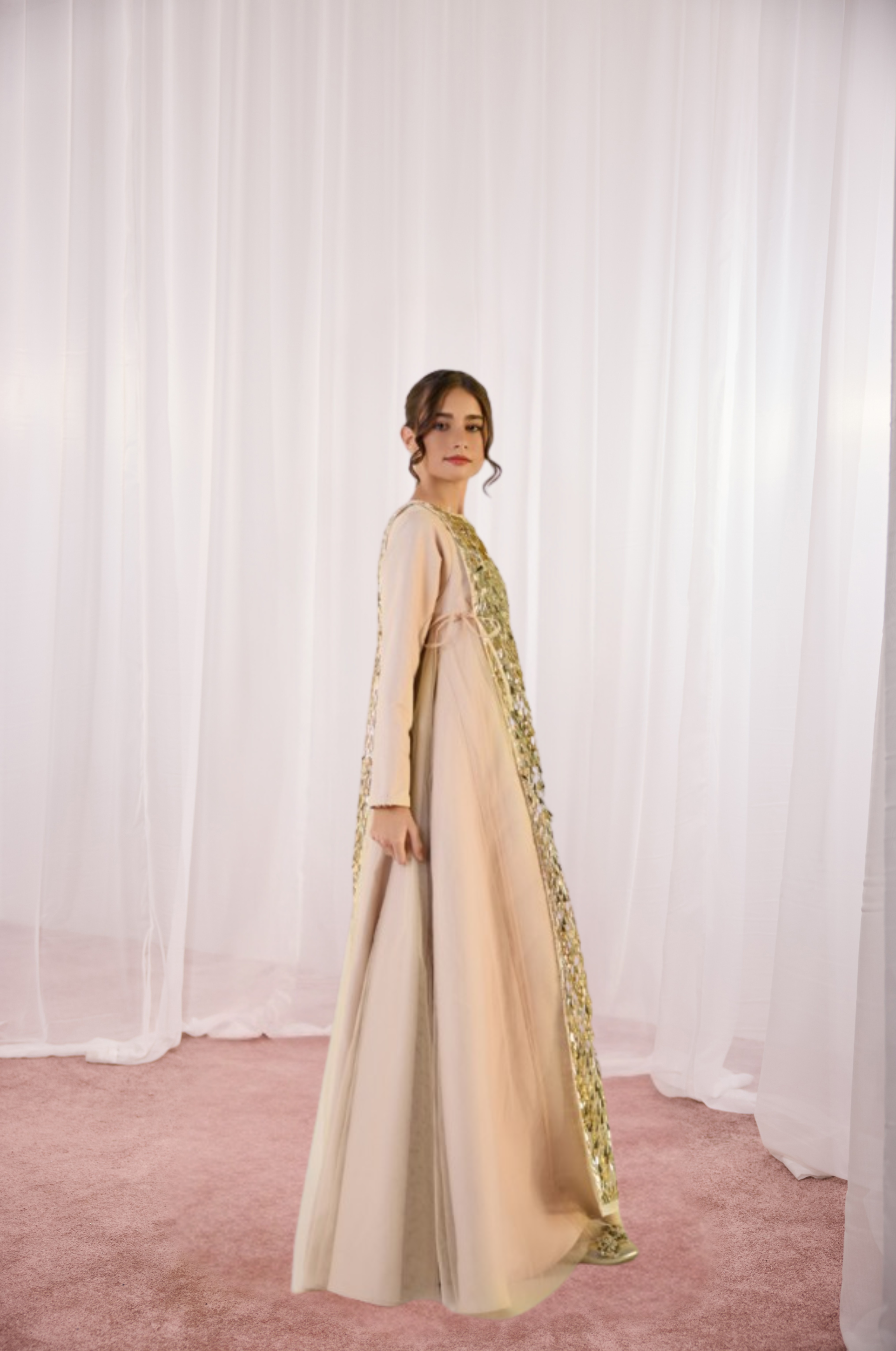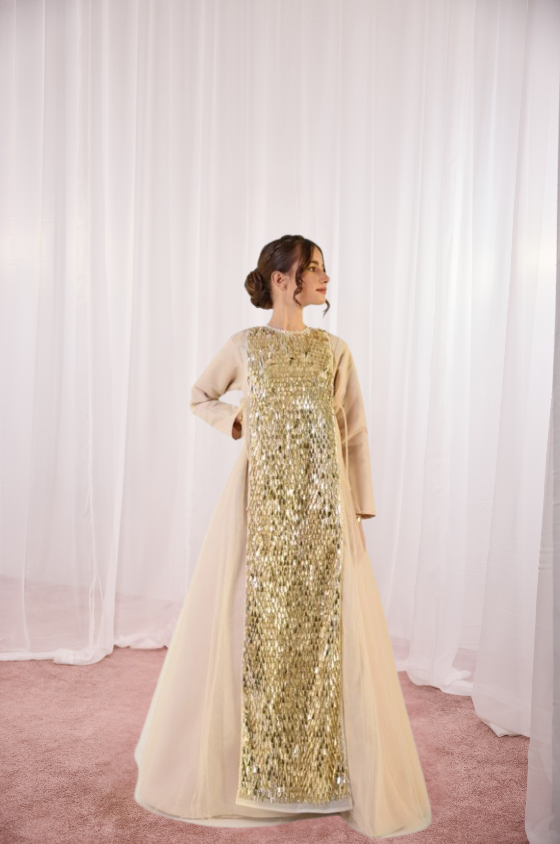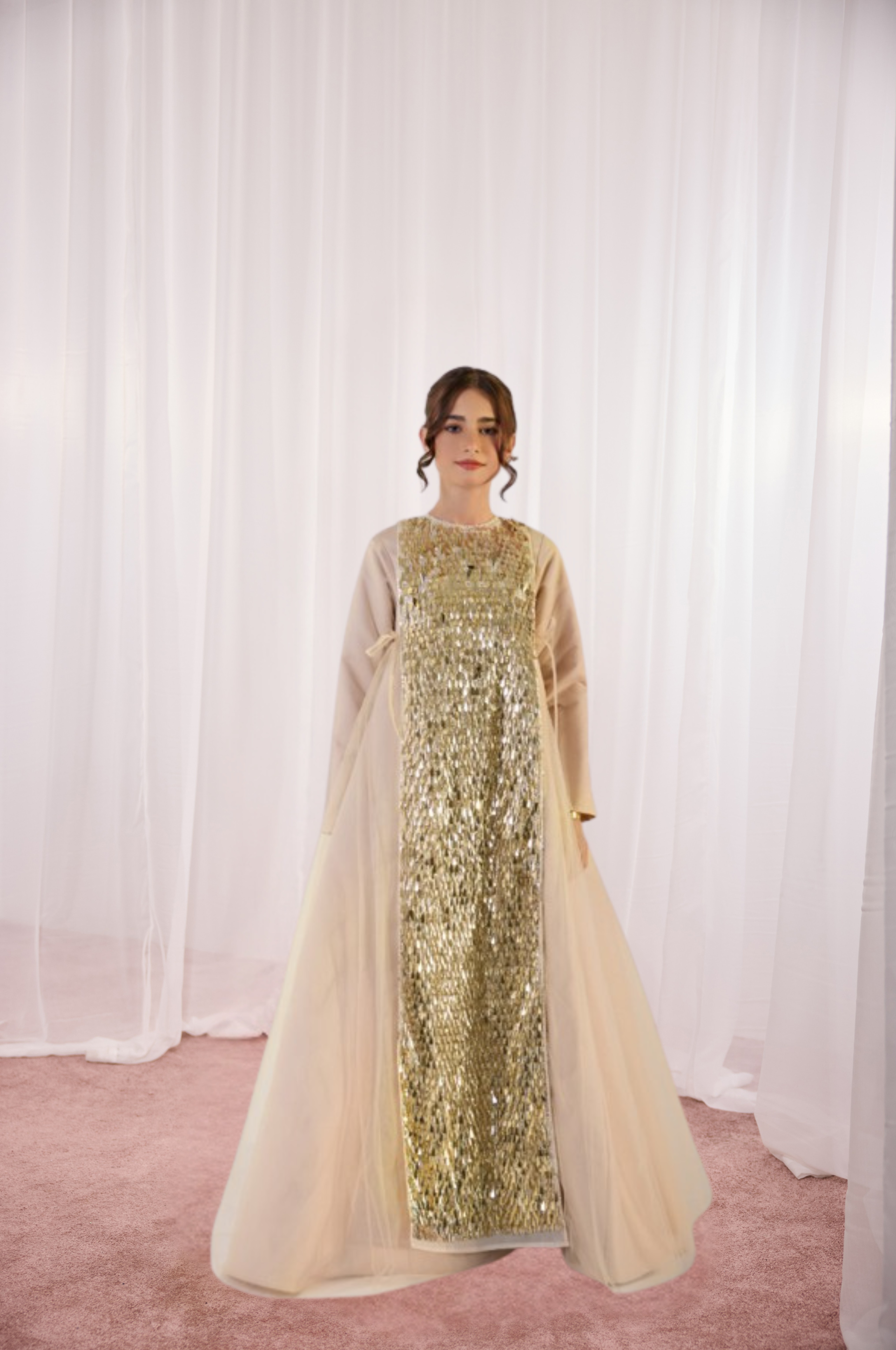 Celebrate the spirit of the season in this ethereal champagne gown, a standout piece from our 2026 Ramadan line. This jalabiya features a striking "gold" sequin center panel framed by layers of soft, flowing tulle that add airy volume and graceful movement. With its modest long sleeves and delicate side-tie details, it is a sophisticated yet dreamy ensemble perfect for creating unforgettable family memories this Ramadan.